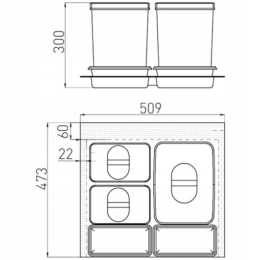 Kildesorteringssystem Multino 60 Cm Med 3 Beholdere Og Brett