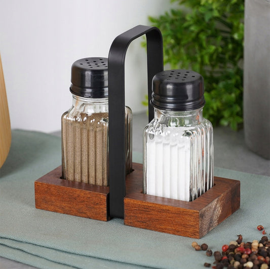 Salt- Og Pepperbøsser I Glass Med Riflet Design Og Akasietre-Stativ
