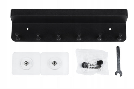 Elegant nøkkelhylle med 6 kroker og oppbevaringshylle – veggmontert, sort stål | To monteringsvalg